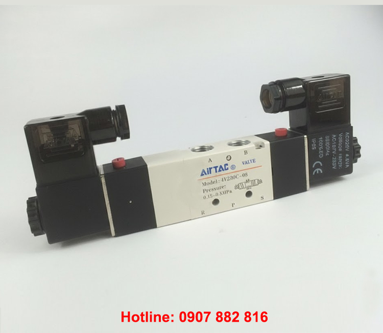 Van điện từ khí nén AIRTAC 4V230-10 là loại van khí nén 5/3 có 5 cổng 3 vị trí và 2 đầu coil điện, kích hoạt và điều khiển bằng điện, thường được dùng để điều khiển xi lanh khí nén.