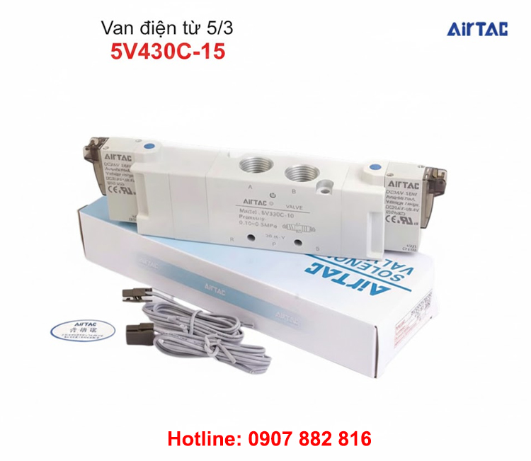 Van điện từ khí nén AIRTAC 5V430C-15 là loại van khí nén 5/3 có 5 cổng 3 vị trí và 2 đầu coil điện, kích hoạt và điều khiển bằng điện, thường được dùng để điều khiển xi lanh khí nén.