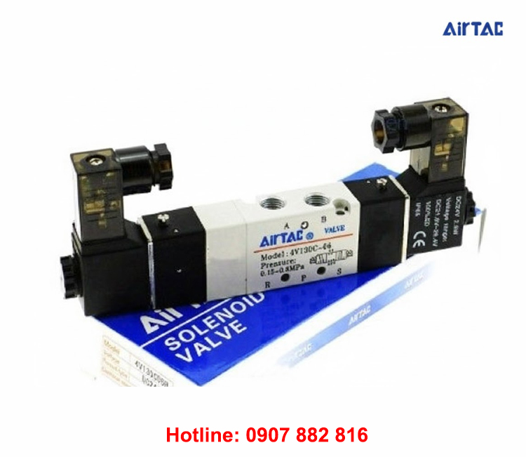 Van điện từ khí nén AIRTAC 4V130-06 là loại van khí nén 5/3 có 5 cổng 3 vị trí và 2 đầu coil điện, điều khiển bằng điện, thường được dùng để điều khiển xi lanh khí nén (ben hơi).
