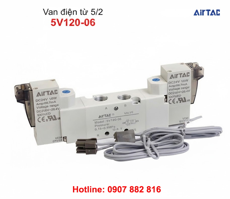 Van điện từ khí nén AIRTAC 5V120-06 là loại van khí nén 5/2 có 5 cổng 2 vị trí và 2 đầu coil điện, kích hoạt và điều khiển bằng điện, thường được dùng để điều khiển xi lanh khí nén.