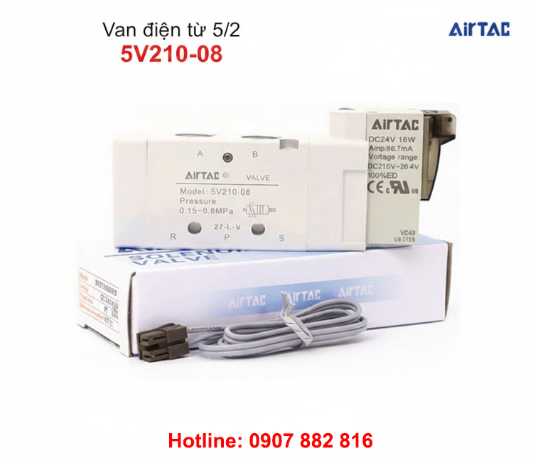 Van điện từ khí nén AIRTAC 5V210-08 là loại van khí nén 5/2 có 5 cổng 2 vị trí và 1 đầu coil điện, kích hoạt và điều khiển bằng điện, thường được dùng để điều khiển xi lanh khí nén.