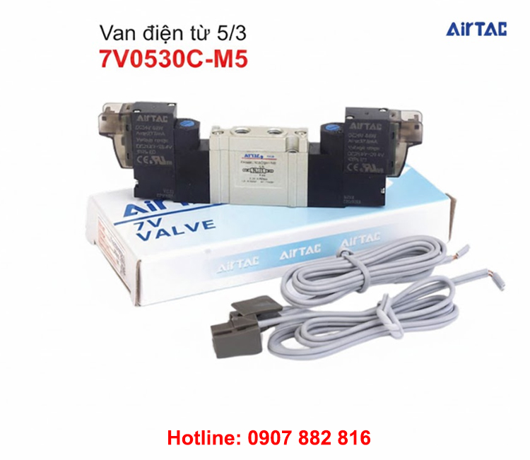 Van điện từ khí nén AIRTAC 7V0530C-M5 là loại van khí nén 5/3 có 5 cổng 3 vị trí và 2 đầu coil điện, kích hoạt và điều khiển bằng điện, thường được dùng để điều khiển xi lanh khí nén.