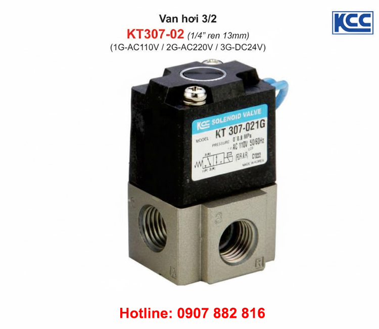 Van điện từ khí nén KCC KT307-02 là loại van khí nén 3/2 có 3 cổng 2 vị trí và 1 đầu coil điện, kích hoạt và điều khiển bằng điện, van có chức năng đóng, mở, xả.