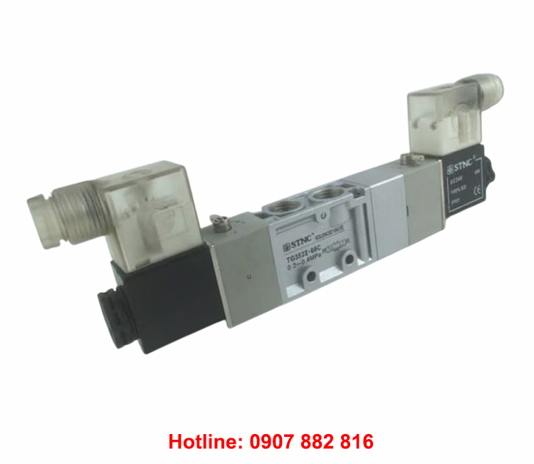 Van solenoid khí nén STNC TG3522-08C là loại van hơi có 5 cổng 3 vị trí (5/3) và 2 đầu coil điện, thường được dùng để điều khiển và phân phối khí giúp xi lanh khí nén (ben hơi) hoạt động.